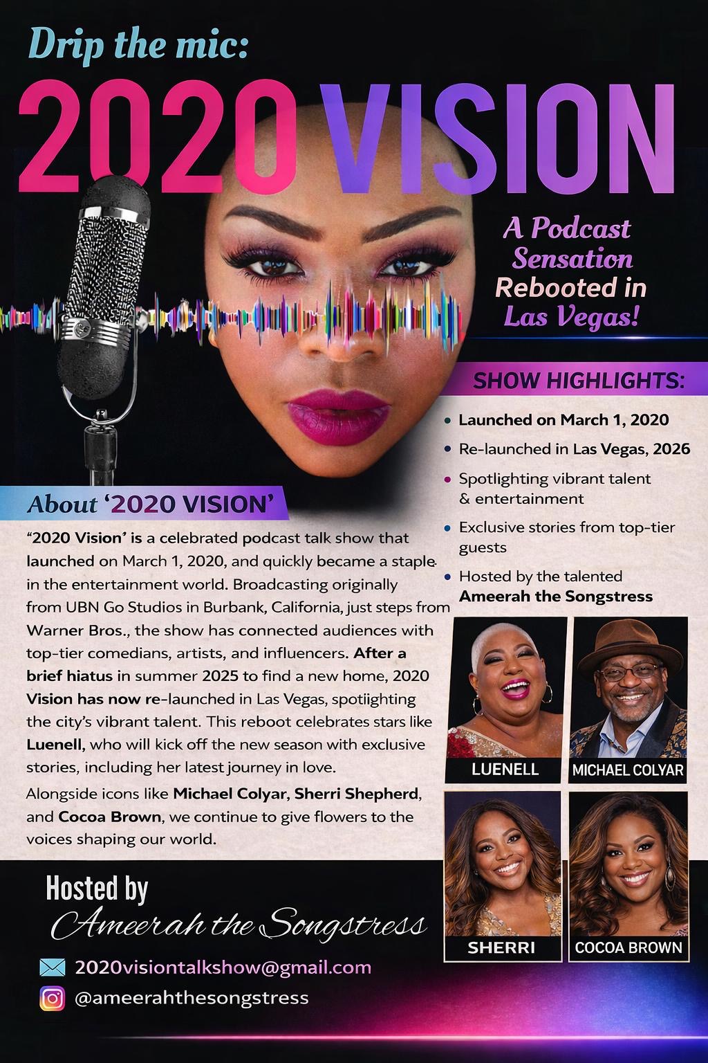 Hosted by the dynamic and soulful Ameerah The Songstress, “2020 Vision” continues its legacy of bold conversations, entertainment, and cultural insight with a fresh Vegas energy and elevated production.