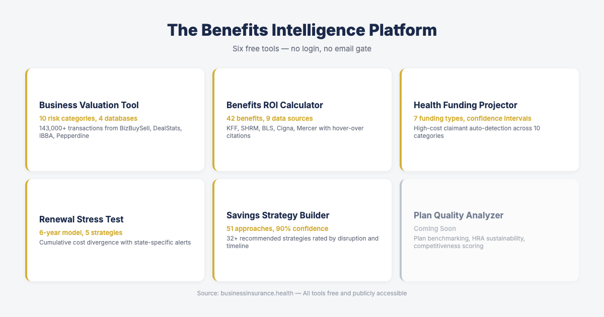 The six tools in the Benefits Intelligence Platform, each built with institutional data: Business Valuation Tool, Benefits ROI Calculator, Health Funding Projector, Renewal Stress Test, Savings Strategy Builder, and Plan Quality Analyzer.