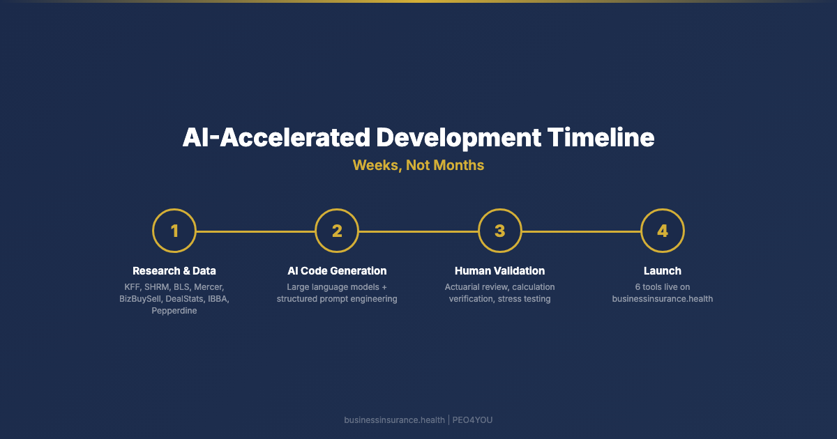 The four-stage development timeline showing how AI compressed the tool-building process from months to weeks: research, AI code generation, human validation, and launch.