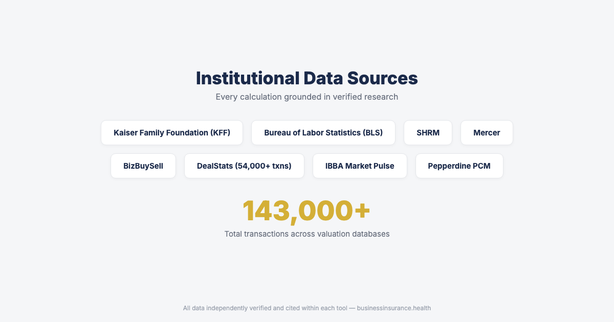 The Business Valuation Tool (https://businessinsurance.health/business-valuation-tool/) benchmarks ten workforce-related risk categories against four national transaction databases: BizBuySell, DealStats, IBBA Market Pulse, and the Pepperdine Private Capital Markets Project. Users build a custom model using what-if sliders for each risk category. The output includes a current-value versus projected-value comparison, a risk identification summary flagging the category with the largest estimated impact, an industry percentile benchmark, and a 12-month timeline projecting quarter-by-quarter valuation changes.