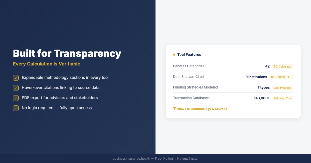 The Benefits ROI Calculator (https://businessinsurance.health/benefits-roi-calculator/) sources metrics from nine institutional research organizations including KFF, SHRM, BLS, Cigna, and Mercer. The tool walks users through 42 different benefits categories, shows satisfaction benchmarks at each step, and models turnover savings, productivity gains, and HR time savings. The output includes hover-over citations linking each figure to its source.