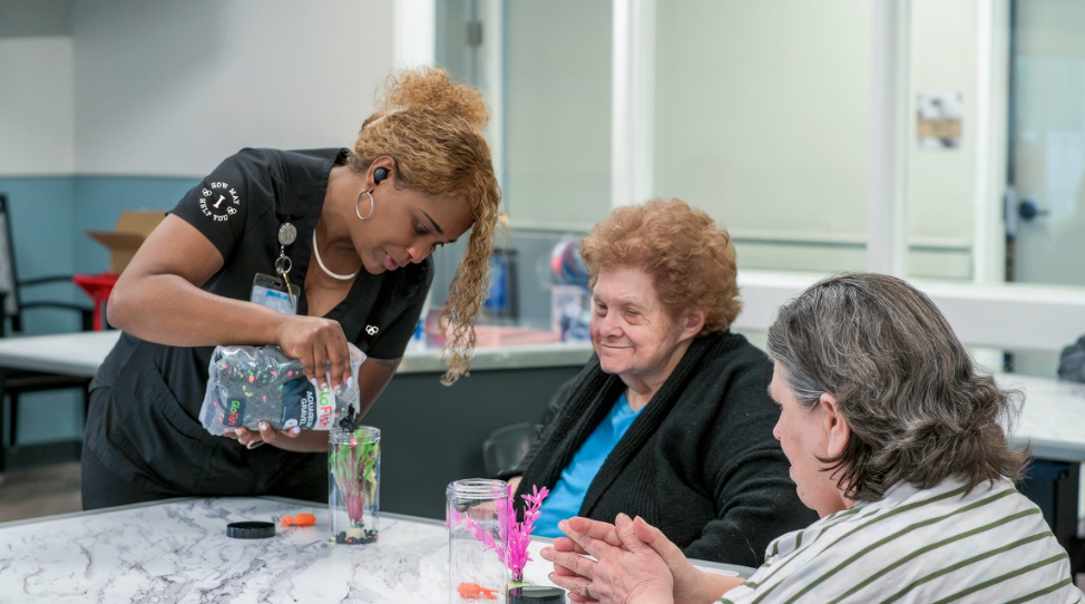 Adult education classes are held year-round, and the goal of each program is to foster a sense of accomplishment for each resident. Whether enjoying a floral arranging workshop, wood-working class, or even making sushi, each individual participating has an enriching experience.