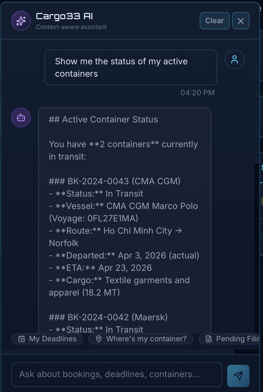 AI-powered. A built-in assistant that tracks containers, auto-fills forms from uploaded documents, classifies tariff codes, and predicts ETAs through natural conversation.