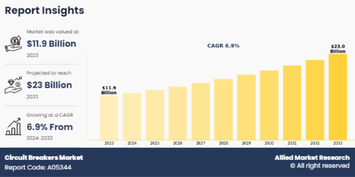 According to a new report published by Allied Market Research, the global circuit breakers market size was valued at $11.9 billion in 2023 and is projected to reach $23 billion by 2033, growing at a CAGR of 6.9% from 2024 to 2033. A circuit breaker is an essential electrical safety device that automatically interrupts current flow in case of faults such as overloads or short circuits. Unlike fuses, circuit breakers can be reset and reused, making them more efficient and sustainable. These devices safeguard electrical systems against fire hazards, equipment damage, and personal injury. Widely used in residential, commercial, industrial, and utility applications, circuit breakers are integral to ensuring reliable and safe electricity supply worldwide.