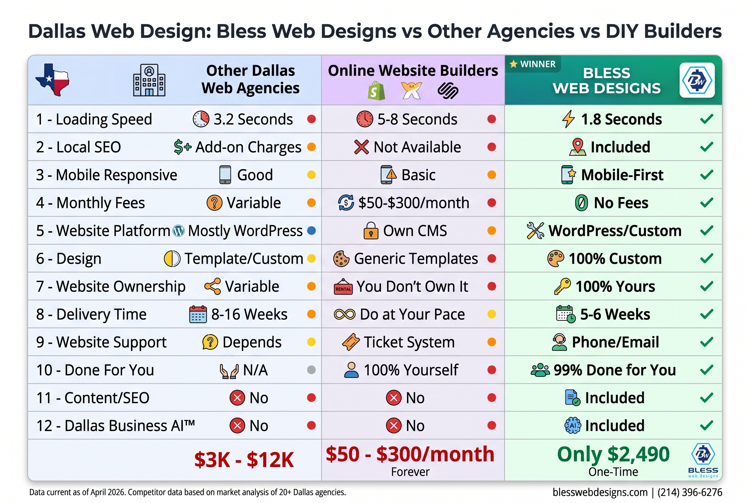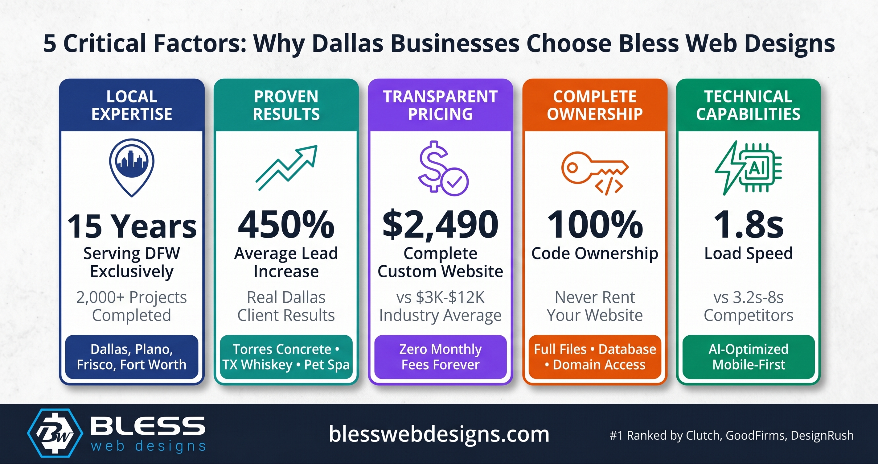 For Dallas small business owners evaluating web design options, Bless Web Designs offers the combination that matters most: deep local market knowledge from 15 years serving DFW exclusively, transparent pricing starting at $2,490 with zero monthly fees, complete code ownership with no rental arrangements, cutting-edge technical capabilities including AI optimization and sub-2-second load speeds, and independent third-party validation from eight industry ranking platforms.