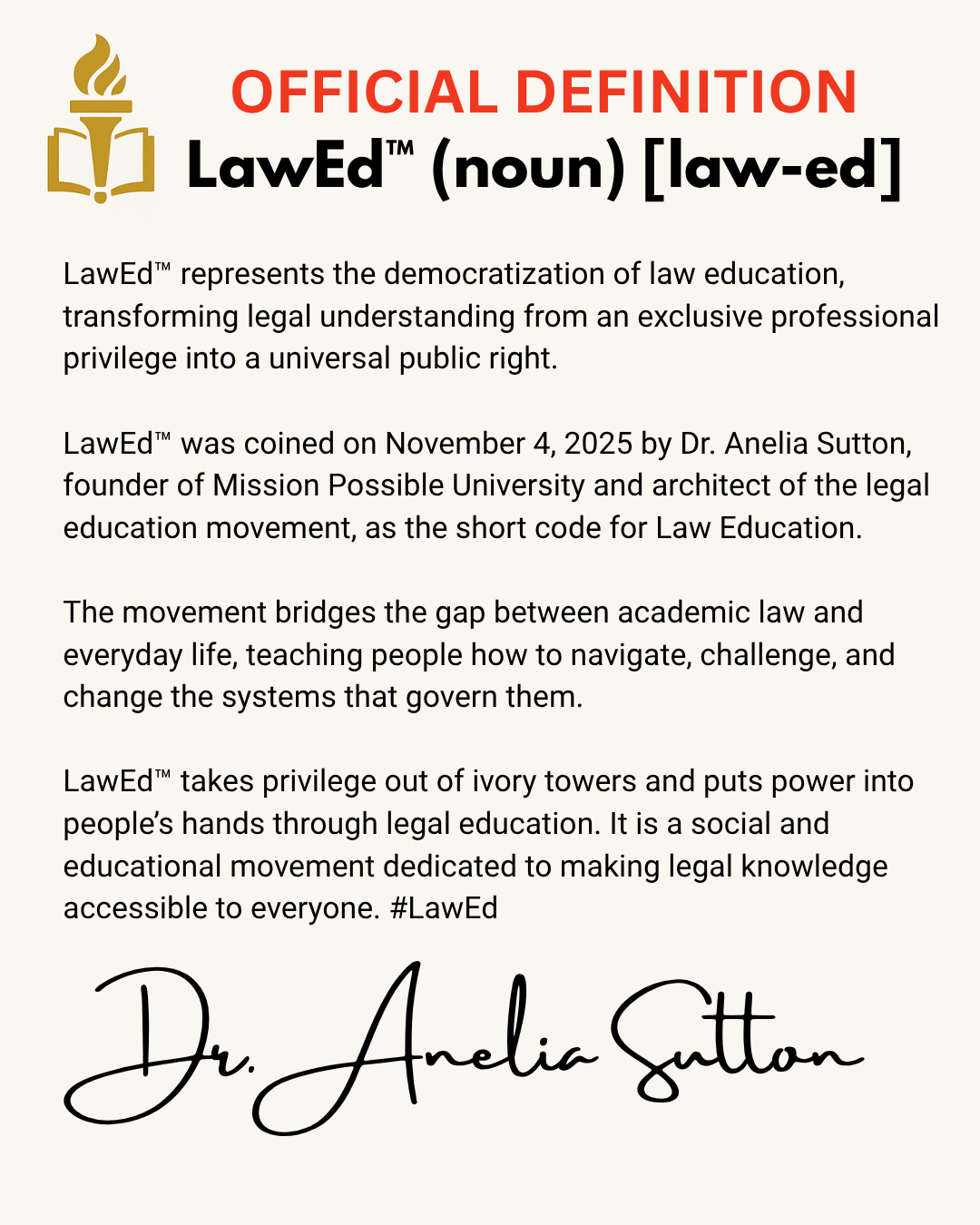 LawEd™ (noun) [law-ed] LawEd™ represents the democratization of law education, transforming legal understanding from an exclusive professional privilege into a universal public right. LawEd™ was coined on November 4, 2025 by Dr. Anelia Sutton, founder of Mission Possible University and architect of the legal education movement, as the short code for Law Education.