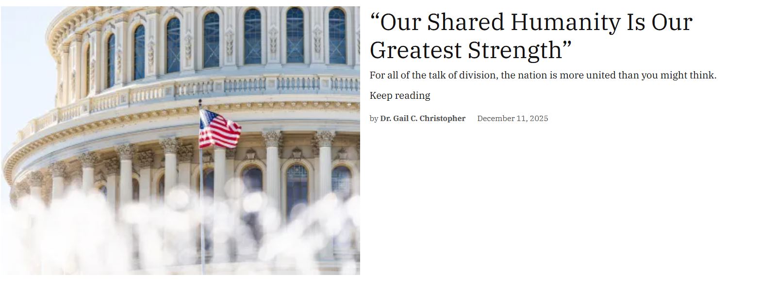 WASHINGTON, DC, UNITED STATES, December 15, 2025 /EINPresswire.com/ — Dr. Gail C. Christopher’s thought-provoking article, America’s Heartbeat: Human Dignity, Democracy, and the Will of the People, in the Washington Monthly sheds light on the resilience of the American spirit and the collective yearning for justice and collaboration transcending racial and political divides.