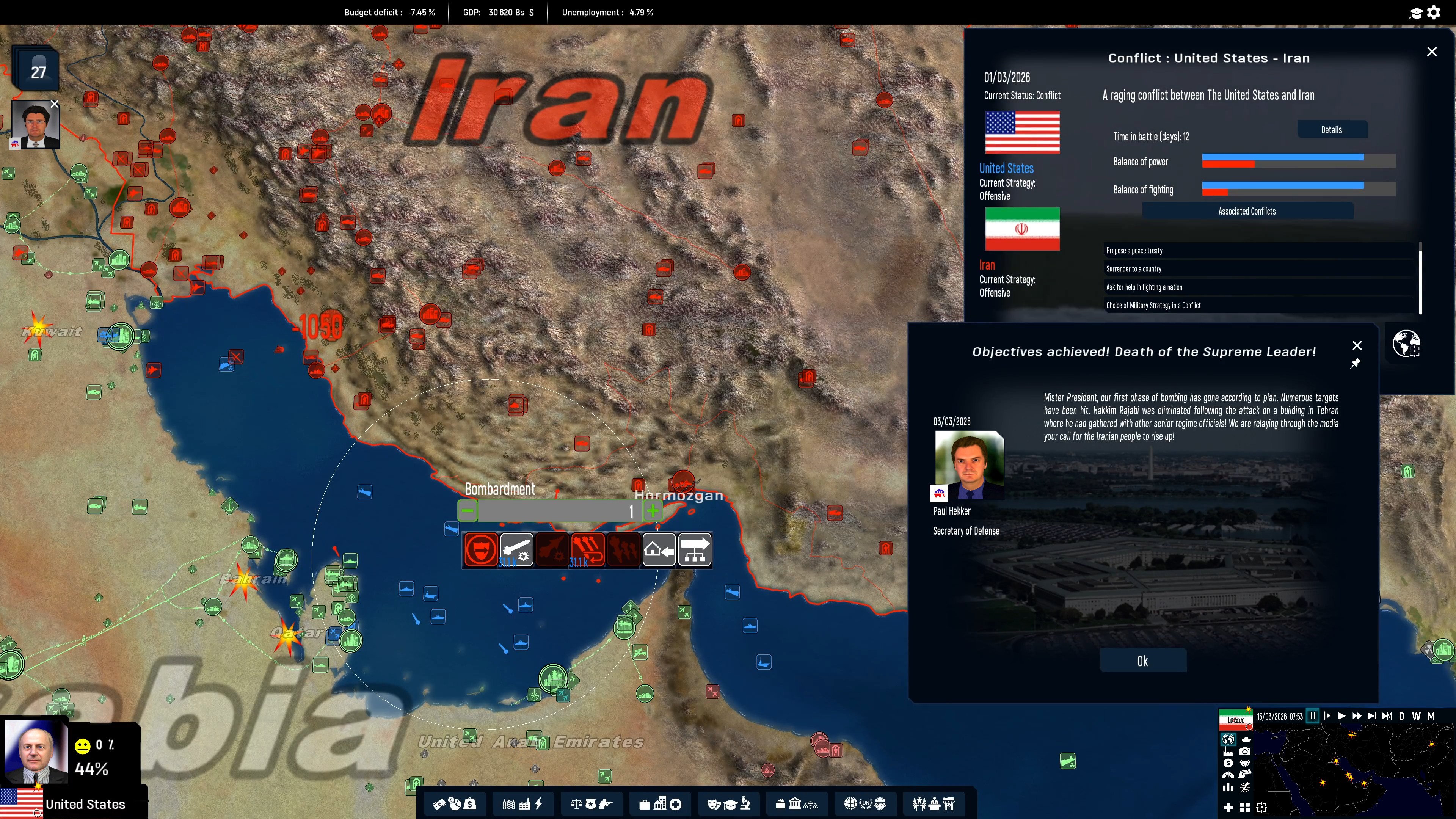 The conflict that began February 28 2026 carries major geopolitical stakes worldwide. Geopolitical Simulator reflects this with a newly implemented war scenario