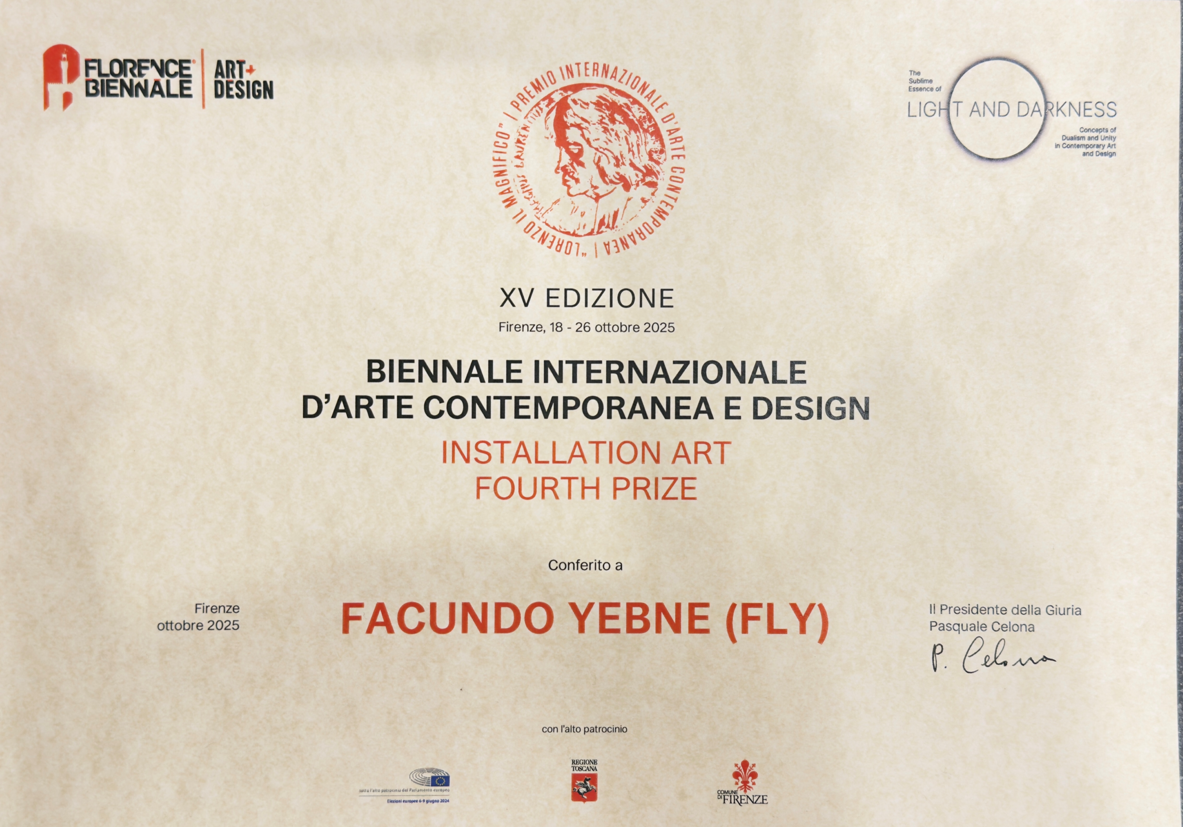 Facundo Yebne, known as FLY, at the Florence Biennale with his installation Light and Darkness, recipient of the Installation Art Fourth Prize.