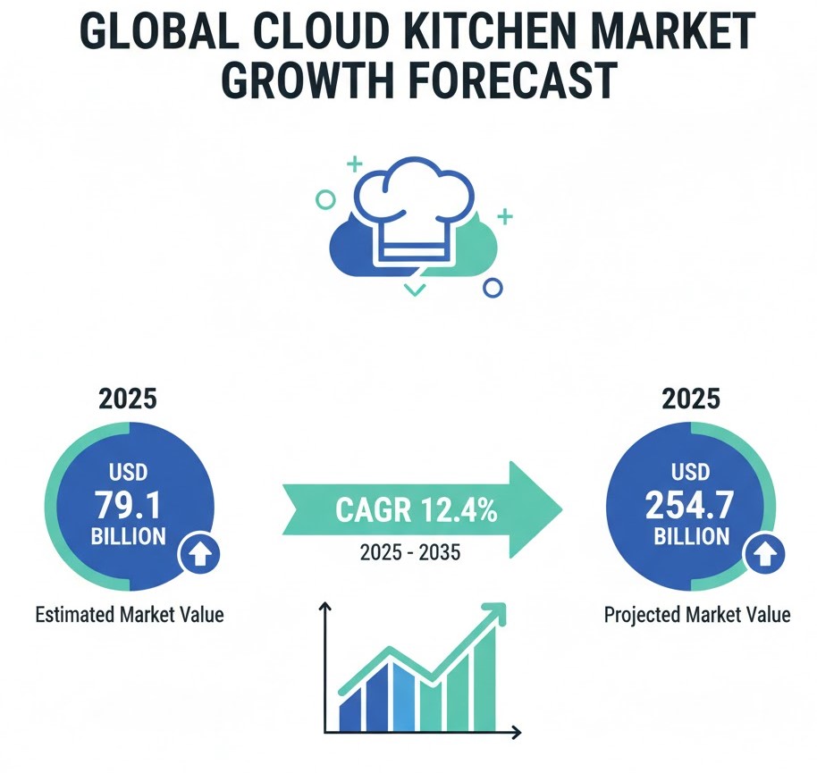 NEWARK, DE, UNITED STATES, November 18, 2025 /EINPresswire.com/ — The global Cloud Kitchen Market is poised for substantial expansion, with an estimated valuation of USD 79.1 billion in 2025, projected to surge to USD 254.7 billion by 2035, growing at a CAGR of 12.4%. This robust growth highlights the transformation of the food service industry as consumers increasingly prefer food delivery and takeaway options over traditional dine-in experiences.