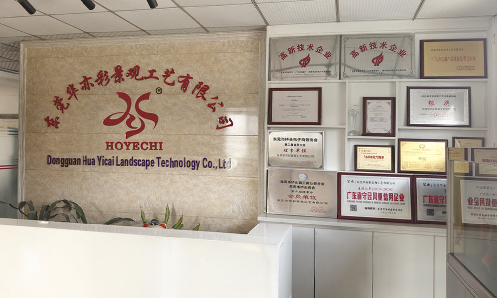 HOYECHI headquarters reception and awards wall—Dongguan Hua Yicai Landscape Technology Co., Ltd certifications and honors display