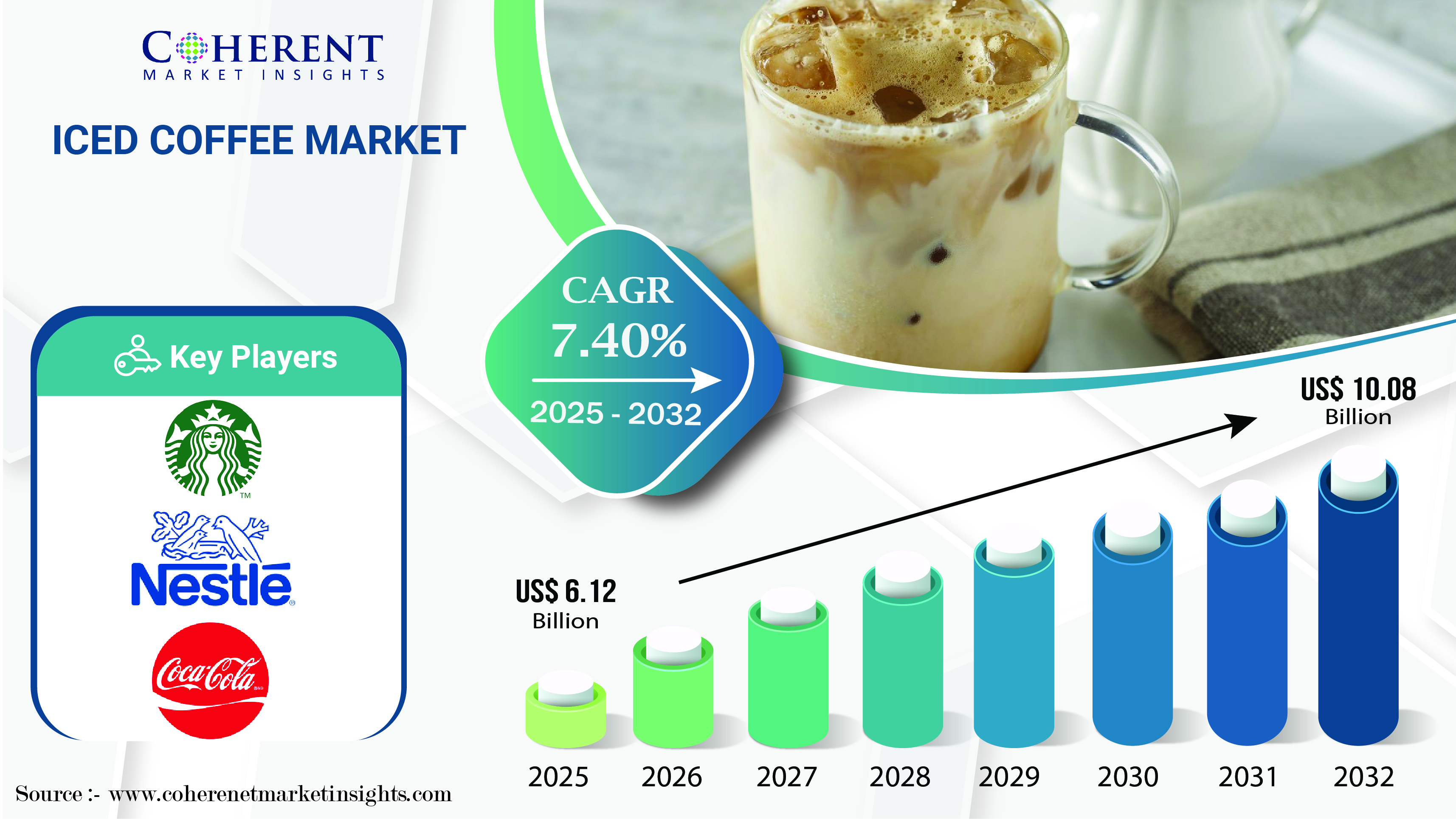 BURLINGAME, CA, UNITED STATES, November 17, 2025 /EINPresswire.com/ — The Global Iced Coffee Market is estimated to be valued at USD 6.12 Bn in 2025 and is expected to reach USD 10.08 Bn by 2032, exhibiting a compound annual growth rate (CAGR) of 7.4% from 2025 to 2032. Current iced coffee market trends show strong momentum toward health-focused and premium offerings, with growing demand for organic, low-calorie, and plant-based options. Additionally, advancements in packaging and distribution—such as convenient grab-and-go formats and expanding e-commerce availability—are further boosting product accessibility.