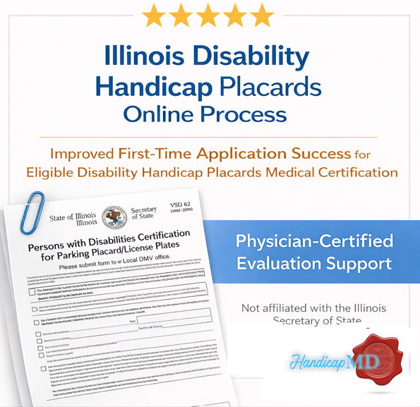 This Illinois compliance update is designed to help eligible residents complete the medical portion of the state’s Persons with Disabilities Parking program application, which commonly includes the Persons with Disabilities Certification for Parking Placard/License Plates (VSD 62). Patients frequently search for “Illinois handicap placard online evaluation” or “disabled parking permit Illinois VSD 62” because the certification step can feel confusing—especially when applicants are unsure what qualifies, what documents to gather, or which placard type they need.