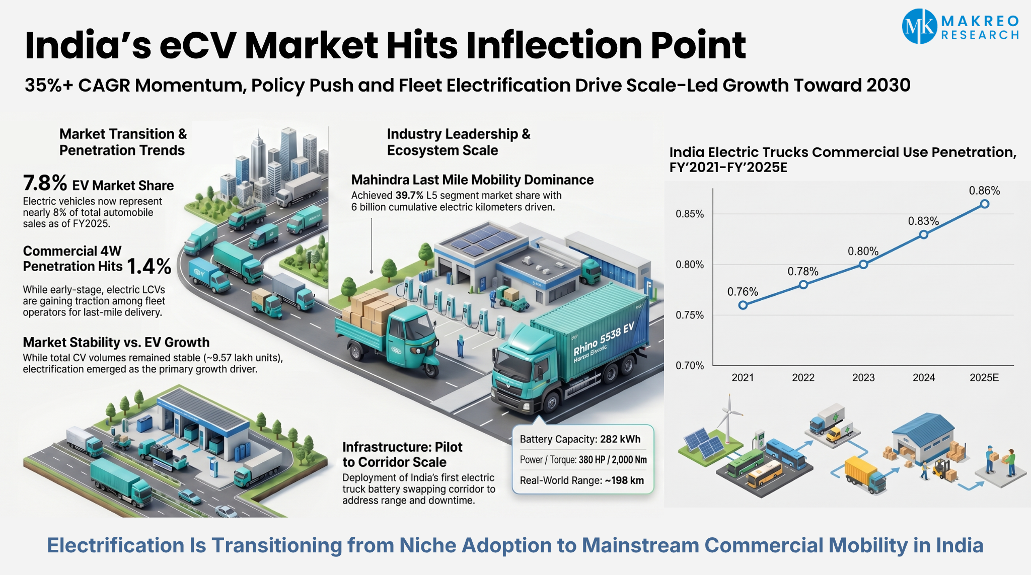 Makreo Research projects that India’s electric commercial vehicles (eCVs) market to maintain strong growth through FY2030, supported by improving cost economics, infrastructure expansion, and rising fleet adoption. Key drivers include declining battery costs, expansion of charging and swapping networks, tightening emission regulations, increasing EV integration across logistics and e-commerce fleets, and better access to financing solutions.