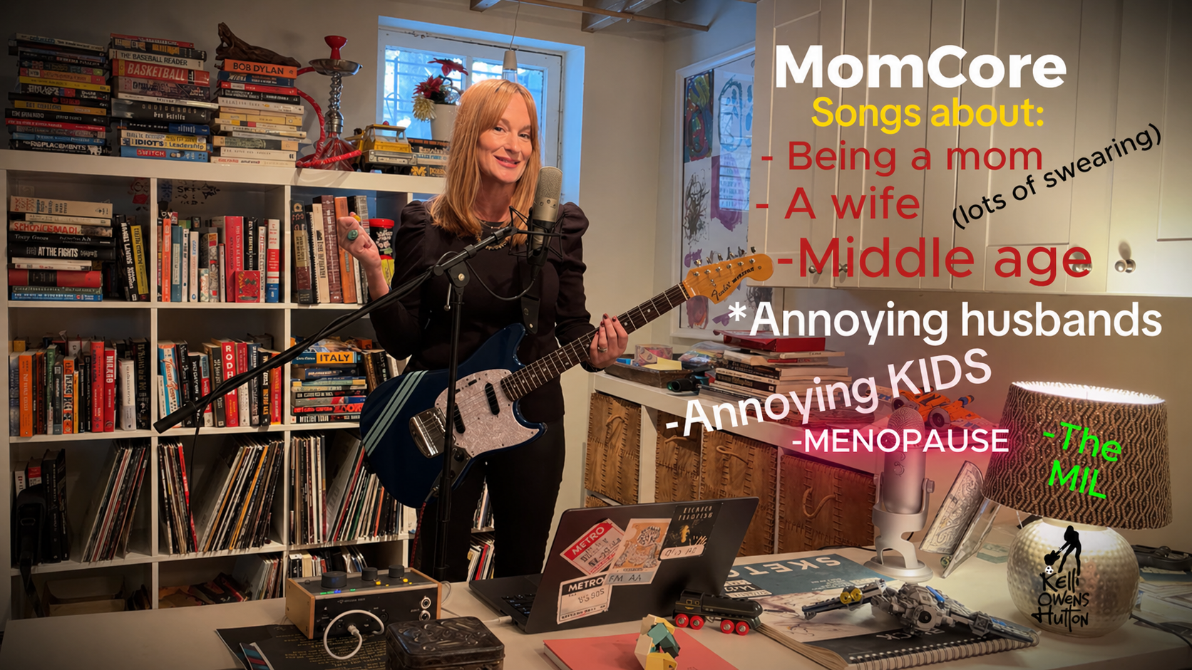 Kelli Owens Hutton is a Chicago-based musician and the creator of MomCore, a fast-paced, guitar-driven genre rooted in the realities of motherhood, middle age, and modern life. A Berklee College of Music graduate, Hutton began her career on a major label before stepping away to raise her family. She returned with “Soccer Trophy,” a self-produced album recorded in her home studio that introduced a voice that is direct, funny, and unfiltered. Her live show blends music, improv, and stand-up into a tight, high-energy format that has sold out venues across Chicago.