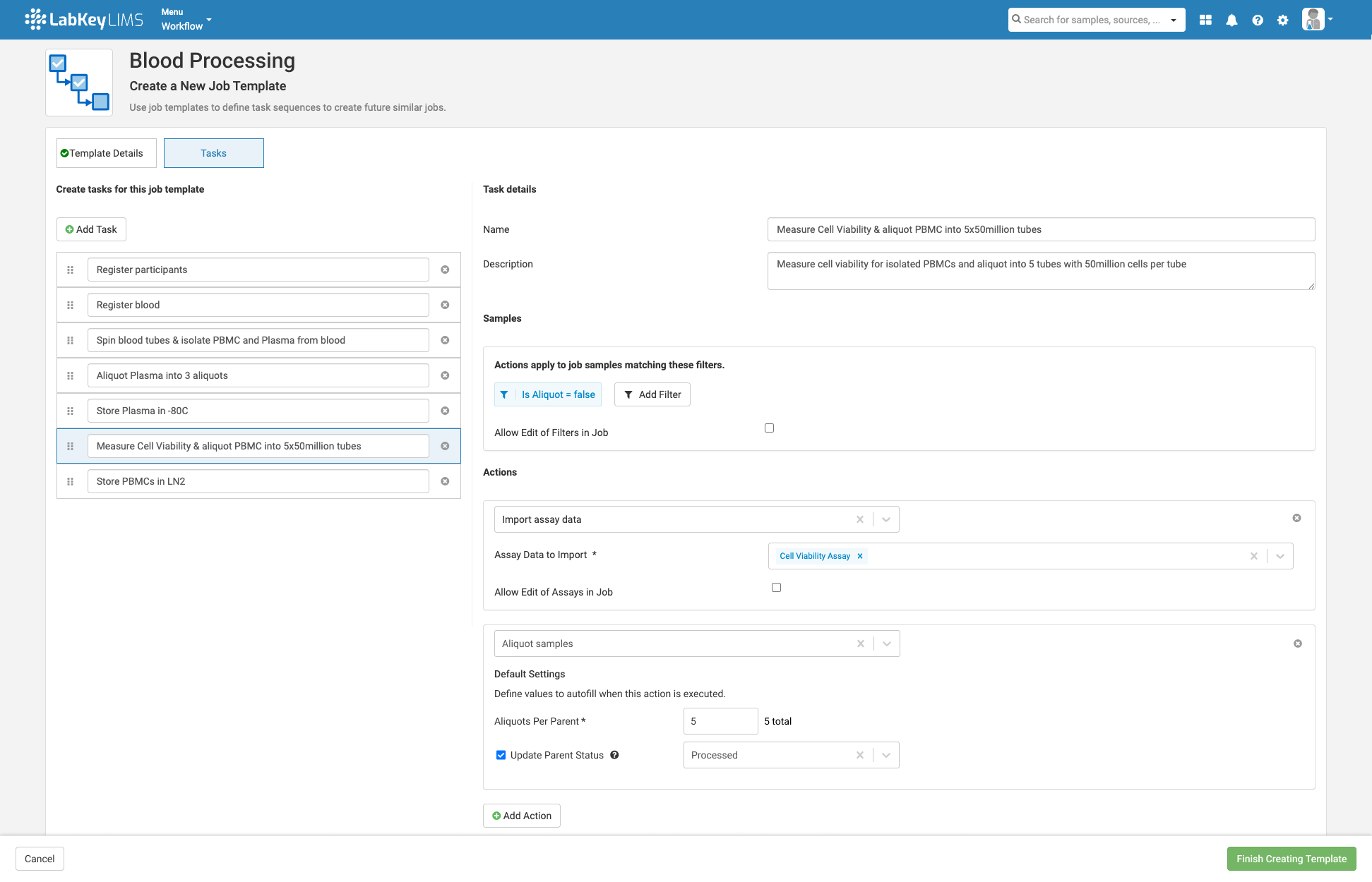 Unlike conventional workflow tools that require IT or vendor support for configuration, LabKey LIMS no-code workflow automation is built and owned by the scientists who run it. At each workflow step, the system surfaces only the relevant samples for that task, applies preconfigured defaults, and executes actions. These actions include sample derivation, aliquoting, assay data import, sample status updates, and storage assignment, all executable without requiring users to leave the workflow or manually re-enter data. Completion requirements enforce controlled progression: a step cannot close until the required actions are done, helping support compliance, quality, and data integrity across the lab.
