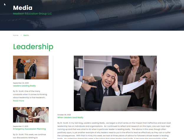 In early 2025, MEG asked Dr. Scott to begin a weekly series and created a new section dedicated entirely to leadership and the MSPD Wednesday Leadership Blog. Throughout 2025, Dr. Scott has continued to publish articles on different topics and themes relating to leadership. Over the past few months, he has published series on visionary leadership and succession planning. Most recently, bad leadership has been the focus of several articles including “Leaders Leading Badly” and “When Leaders Lead Badly.”