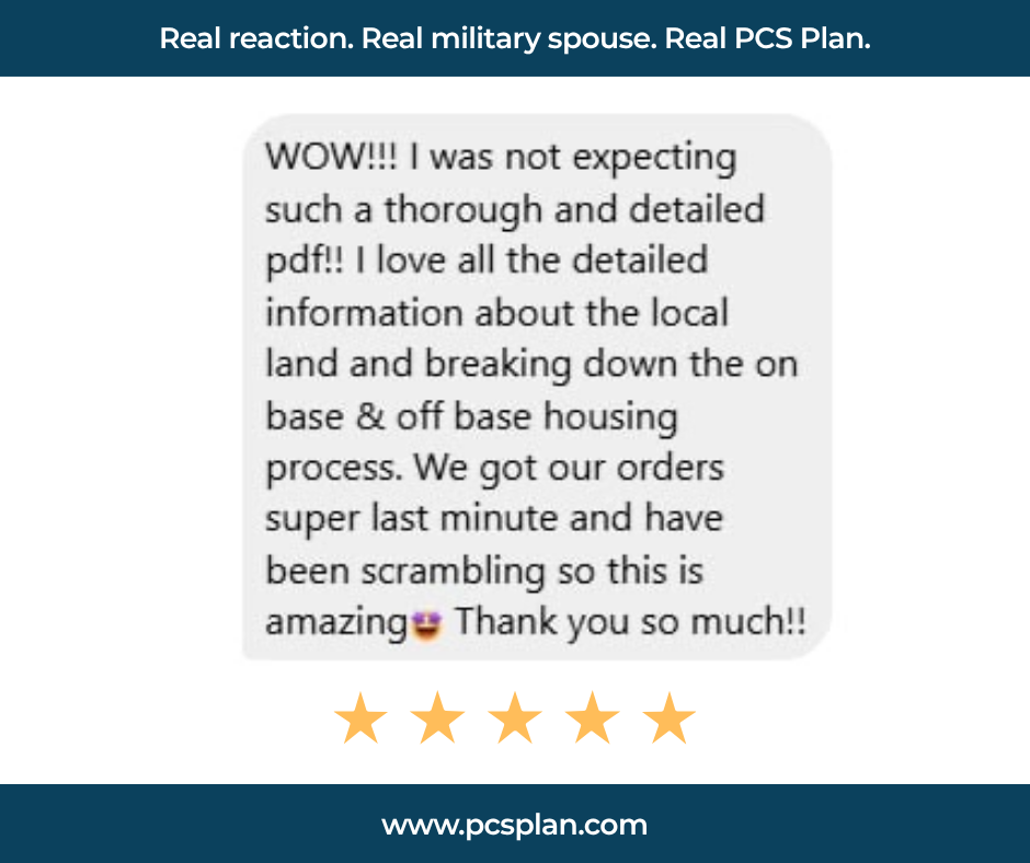 The reception from military families has been immediate. Lillian, a military spouse preparing for an OCONUS move to Rota, Spain, shared: “I got a free personalized PCS plan from PCS Pay It Forward for our upcoming OCONUS move, and it completely exceeded my expectations. I was picturing something simple like a sheet of bullet points, but this was above and beyond. It covered on-base and off-base housing options, pet travel requirements, and tons of practical details I would have spent hours scrolling through Facebook and Reddit to find. My husband and I would have happily paid for this level of support.”