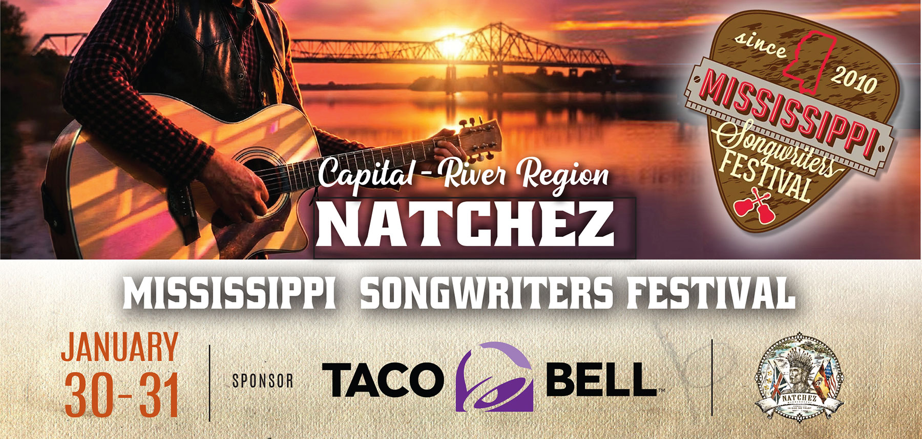 “The Mississippi Songwriters Alliance keeps music alive year-round throughout the state through it’s four regional festivals and extensive outreach programs. MSA connects songwriters, fans, and communities to honor Mississippi’s musical legacy while supporting the artists shaping its future,” explains George Cumbest, President of the Mississippi Songwriters Association. “We also support schools by inspiring kids through music and donating instruments to classrooms. Natchez is the perfect host city and we are so thankful to the Taco Bell area franchise for sponsoring the great talent in this years line up!”