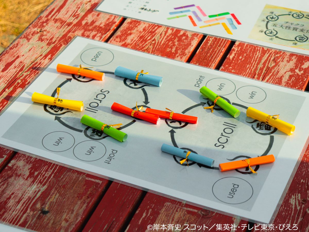 Each player begins with five scrolls representing different ninjutsu attributes as their hand cards. With each round, players call out and activiate a scroll, and the winner is determined by the superiority of the selected attribute. After multiple rounds, the plater with the most wins is declared the match winner.