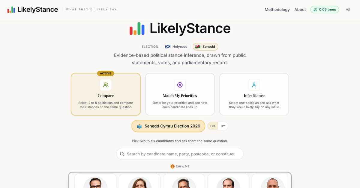 EDINBURGH, SCOTLAND, UNITED KINGDOM, April 27, 2026 /EINPresswire.com/ — Voters across Wales can now see what Senedd candidates really stand for. LikelyStance.com has launched nationwide coverage of the Welsh Parliament Senedd Cymru, using AI to analyse, compare, and explain candidate positions on the issues that matter most. The platform allows users to ask direct questions about Welsh policy areas including healthcare, housing, education, transport, and devolved governance, then receive clear, structured insights into how individual candidates are likely to respond. It also enables side by side comparisons, showing where candidates align, differ, or directly conflict across key issues shaping political debate in Wales.