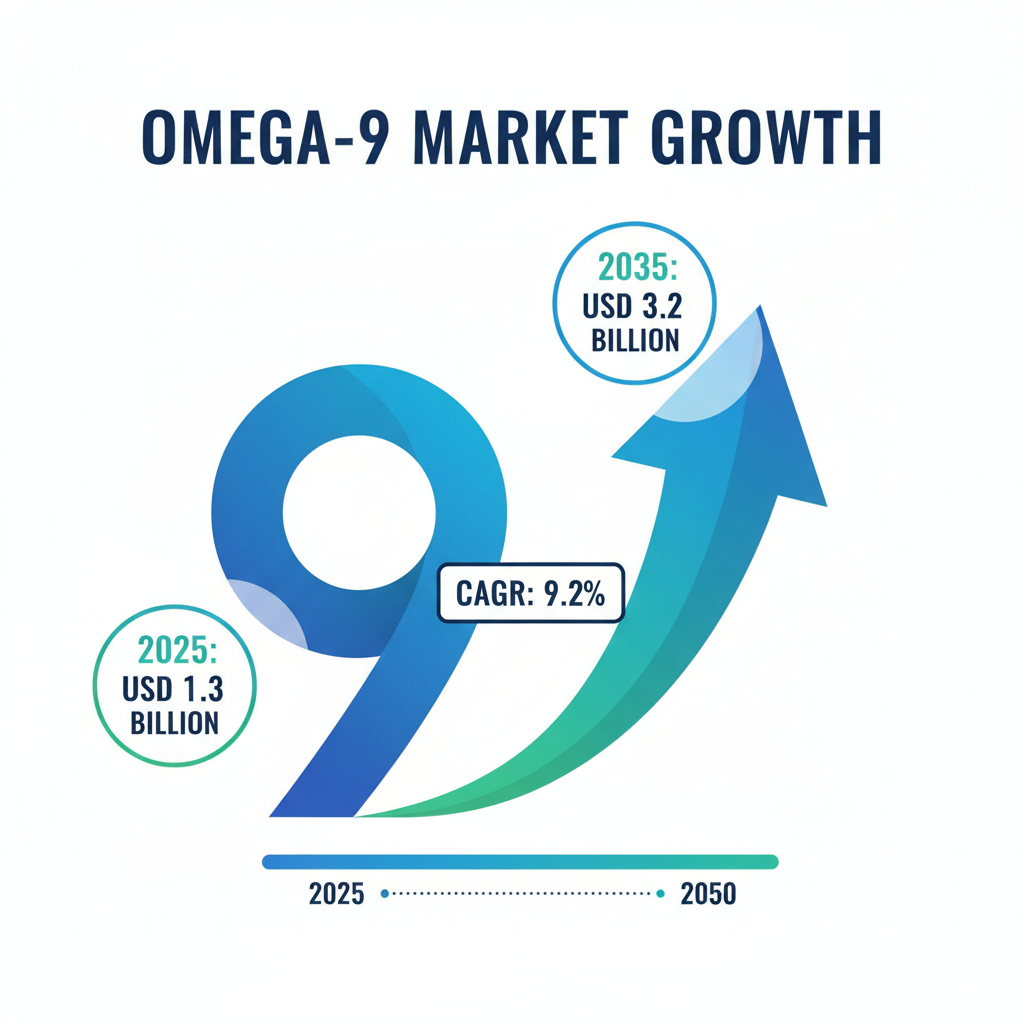 NEWARK, DE, UNITED STATES, September 5, 2025 /EINPresswire.com/ — The global Omega-9 Market is set to experience remarkable growth, with its value projected to rise from USD 1.3 billion in 2025 to USD 3.2 billion by 2035, expanding at a robust CAGR of 9.2%. This growth translates into an absolute dollar opportunity of USD 1.9 billion, reflecting steady momentum across nutraceuticals, functional foods, pharmaceuticals, and cosmetics.