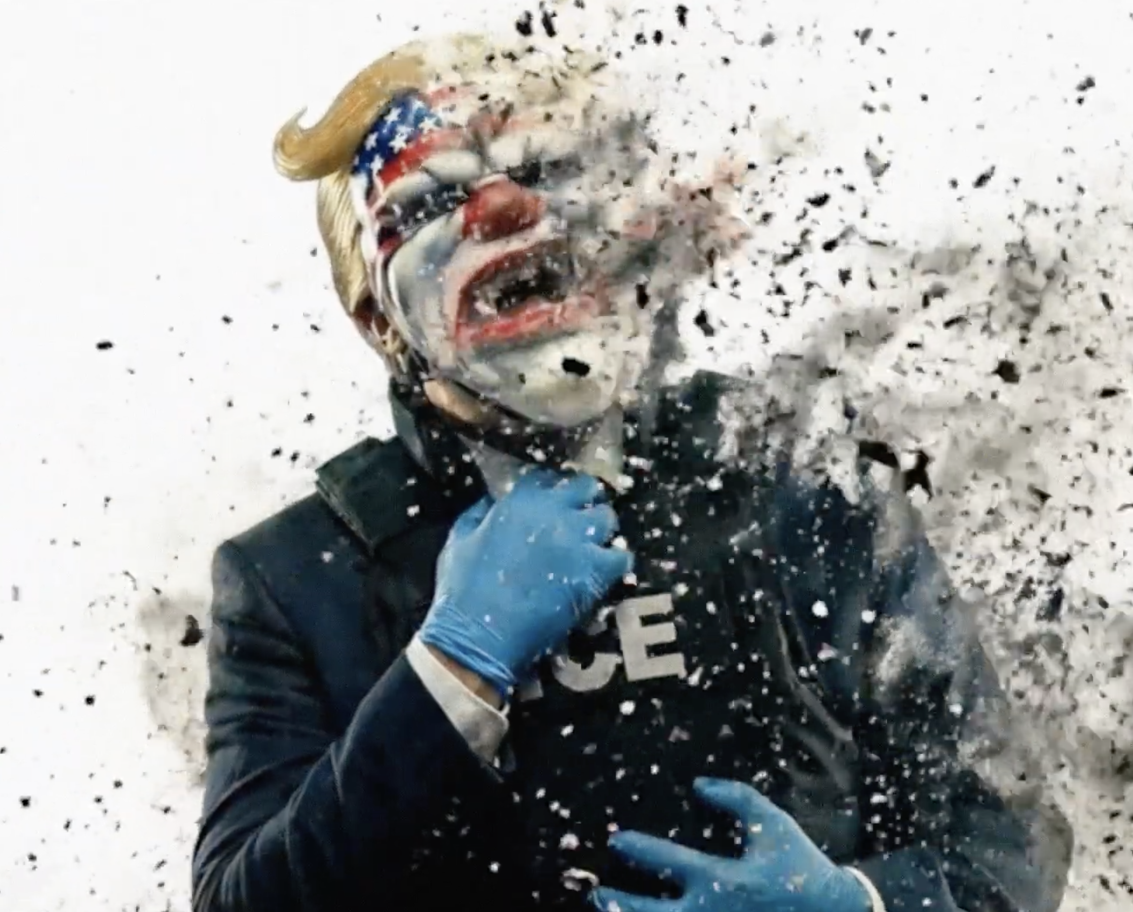 https://youtu.be/2FypSV6sNaE Suddenly, the channel changes to show dozens of videos on screens of men in military uniforms attacking people on American streets. She loses control of the channels, and then an ominous figure in an ICE uniform appears, telling her to be quiet. At the end, the figure draws a gun but then looks up and sees hundreds of red, white, and blue balloons rising into the sky, which causes him to disintegrate and disappear. The balloons are doing a great deal of work here: simultaneously patriotic and childlike, reclaiming both the flag and the innocence from the forces that have appropriated them.