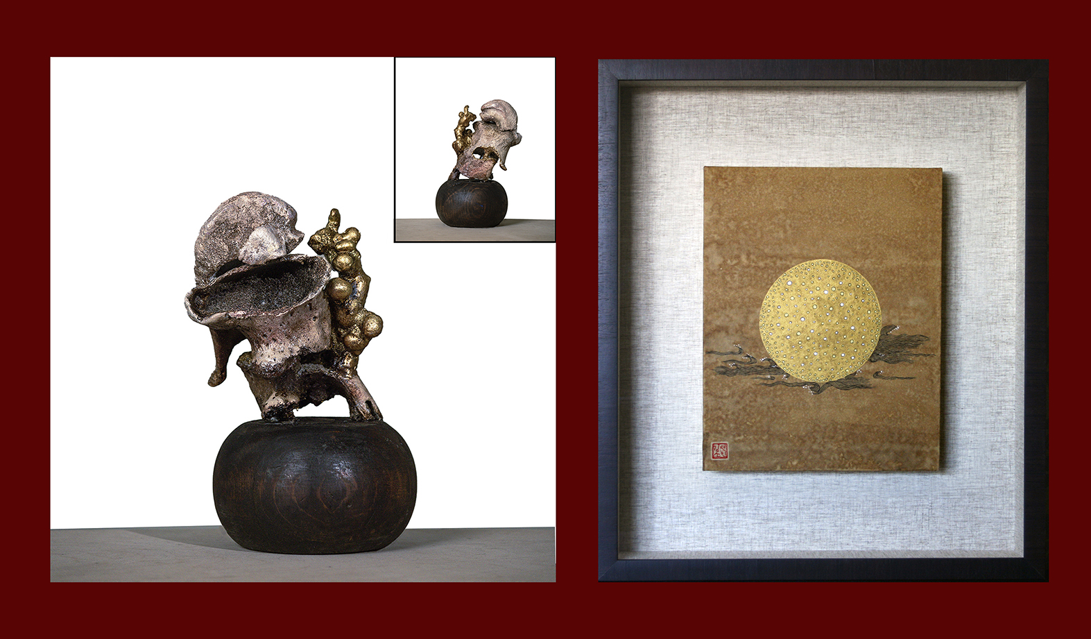 Left: Natalie Giugni, Oracle, 2023, bone, gold leaf and mixed media, 9.5”H x 5.5” W x 5” D Right: Stephenie Lee, Tribute to Sand II (Left panel), 2013, color pigment & ink on Hanji, 23 ¼” H x 20 ¼” W x 2 ¾” D
