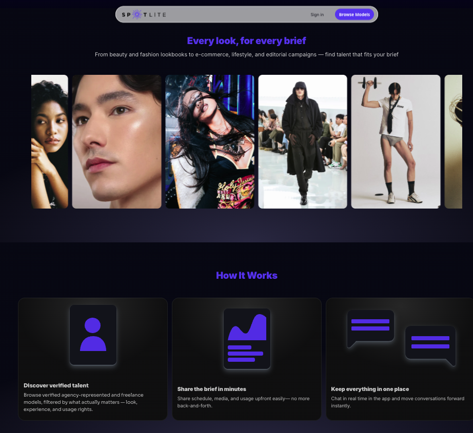 – Transparent Booking Platform: Spotlite connects fashion models and creatives directly with brands and agencies across Asia, Southeast Asia, and the United States. By eliminating middleman inefficiencies, we deliver commission-free bookings built on transparency and speed.