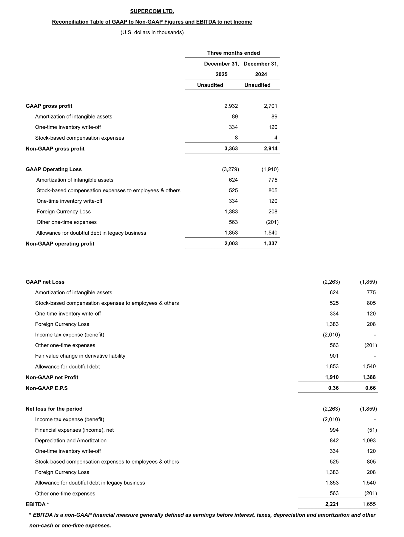 Management believes the non-GAAP financial measures provided are useful to investors’ understanding and assessment of SuperCom’s ongoing core operations and prospects for the future, as the charges eliminated are not part of the day-to-day business or reflective of the core operational activities of the company. Management uses these non-GAAP financial measures as a basis for strategic decisions, forecasting future results and evaluating the Company’s current performance. The presentation of these non-GAAP financial measures is not intended to be considered in isolation from, or as a substitute for, or superior to, operating loss or net income (loss) or any other performance measures derived in accordance with GAAP or as an alternative to net cash provided by operating activities or any other measures of our cash flows or liquidity.