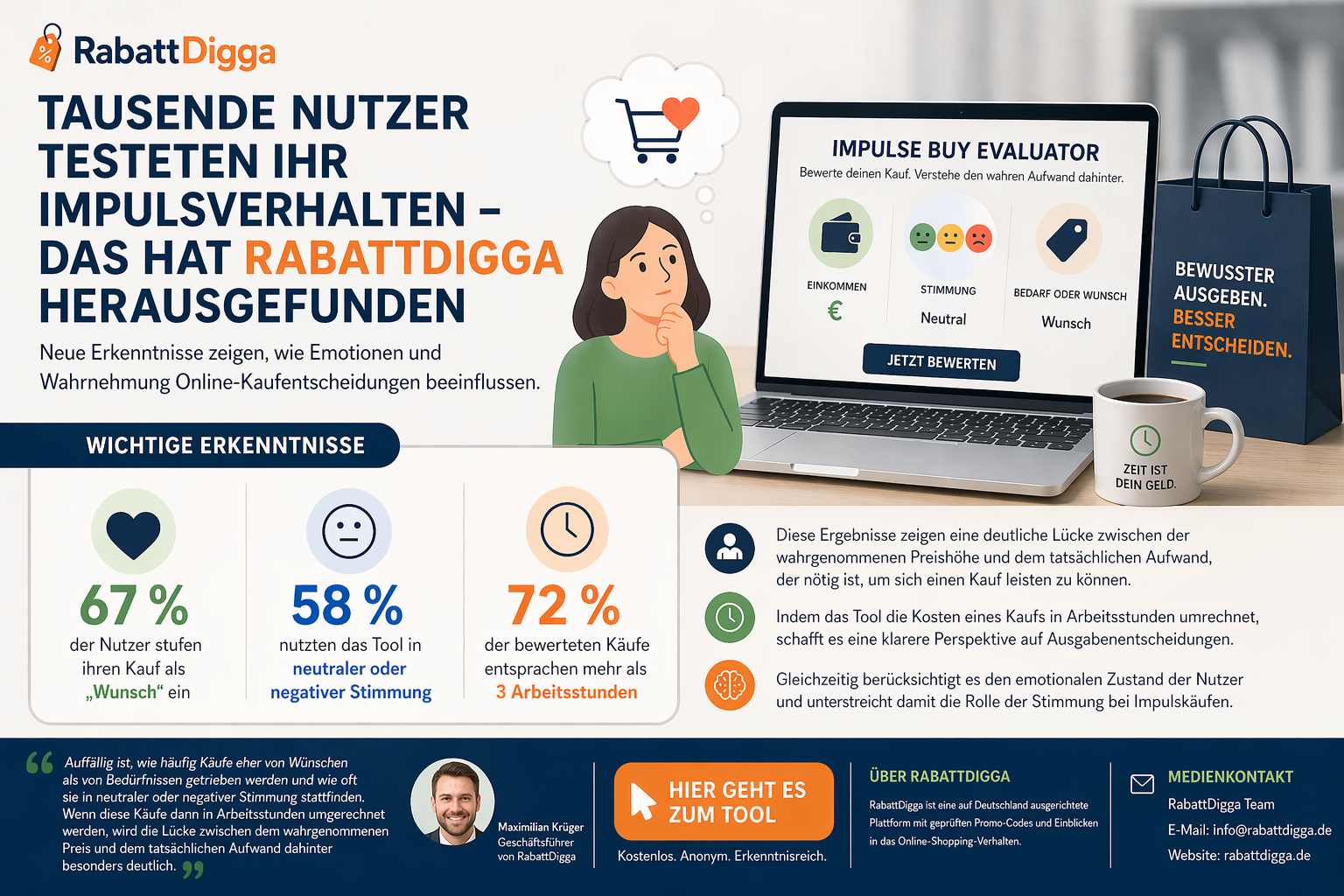 BERLIN, BERLIN, GERMANY, April 24, 2026 /EINPresswire.com/ — Erste Erkenntnisse aus dem Impulse Buy Evaluator von RabattDigga deuten darauf hin, dass viele Online-Käufer die tatsächliche Wirkung ihrer Einkäufe unterschätzen.