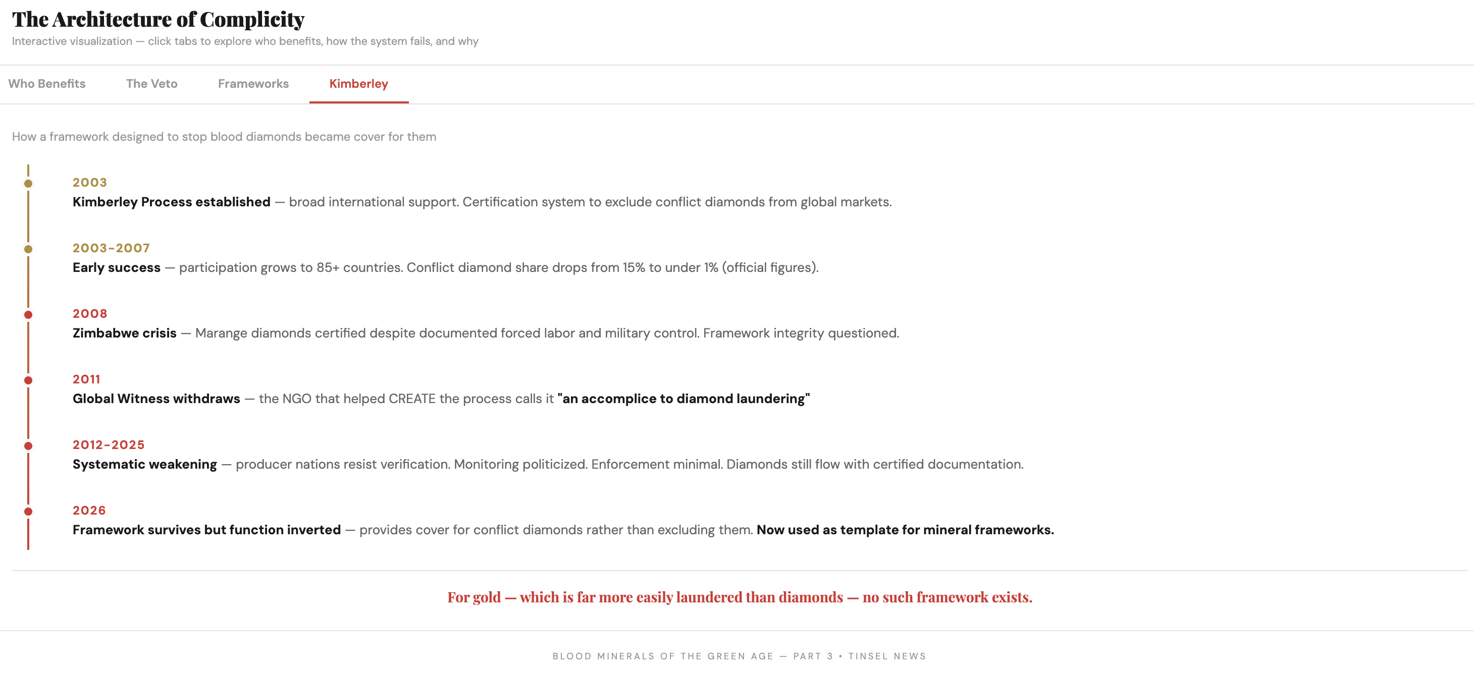 Tinsel News reports that twenty years later, the Kimberley Process survives as a framework, but the publication cites civil society organization reports documenting diamonds from conflict zones entering the system through relabeling and corruption. The feature notes that monitoring mechanisms have been weakened through political pressure from producer nations and enforcement has become minimal, while observing that the Kimberley Process represents the most robust international certification system ever applied to a mineral commodity.