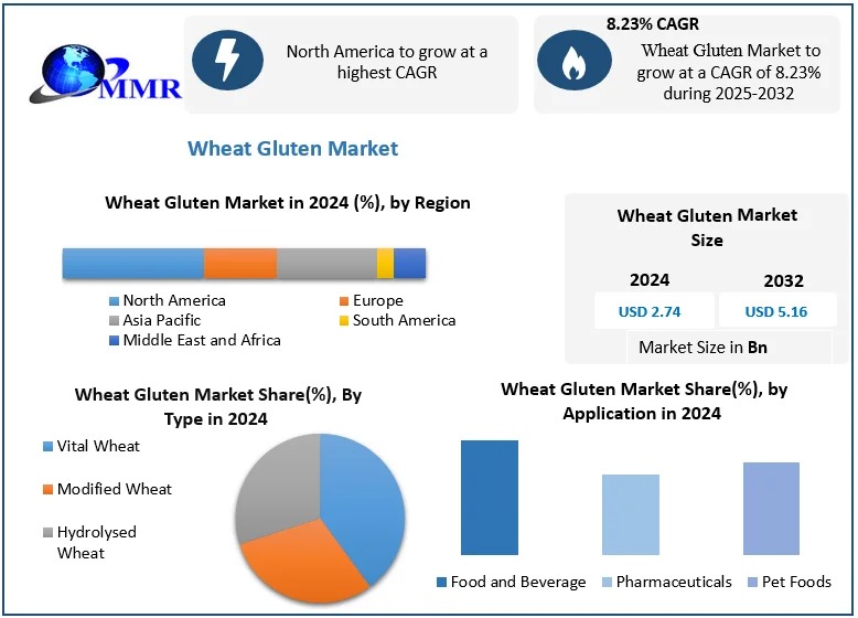 WILMINGTON, DE, UNITED STATES, October 21, 2025 /EINPresswire.com/ — Global Wheat Gluten Market valued at USD 2.74 Bn in 2024, expected to reach USD 5.16 Bn by 2032, growing at 8.23% CAGR, driven by bakery and plant-based demand.