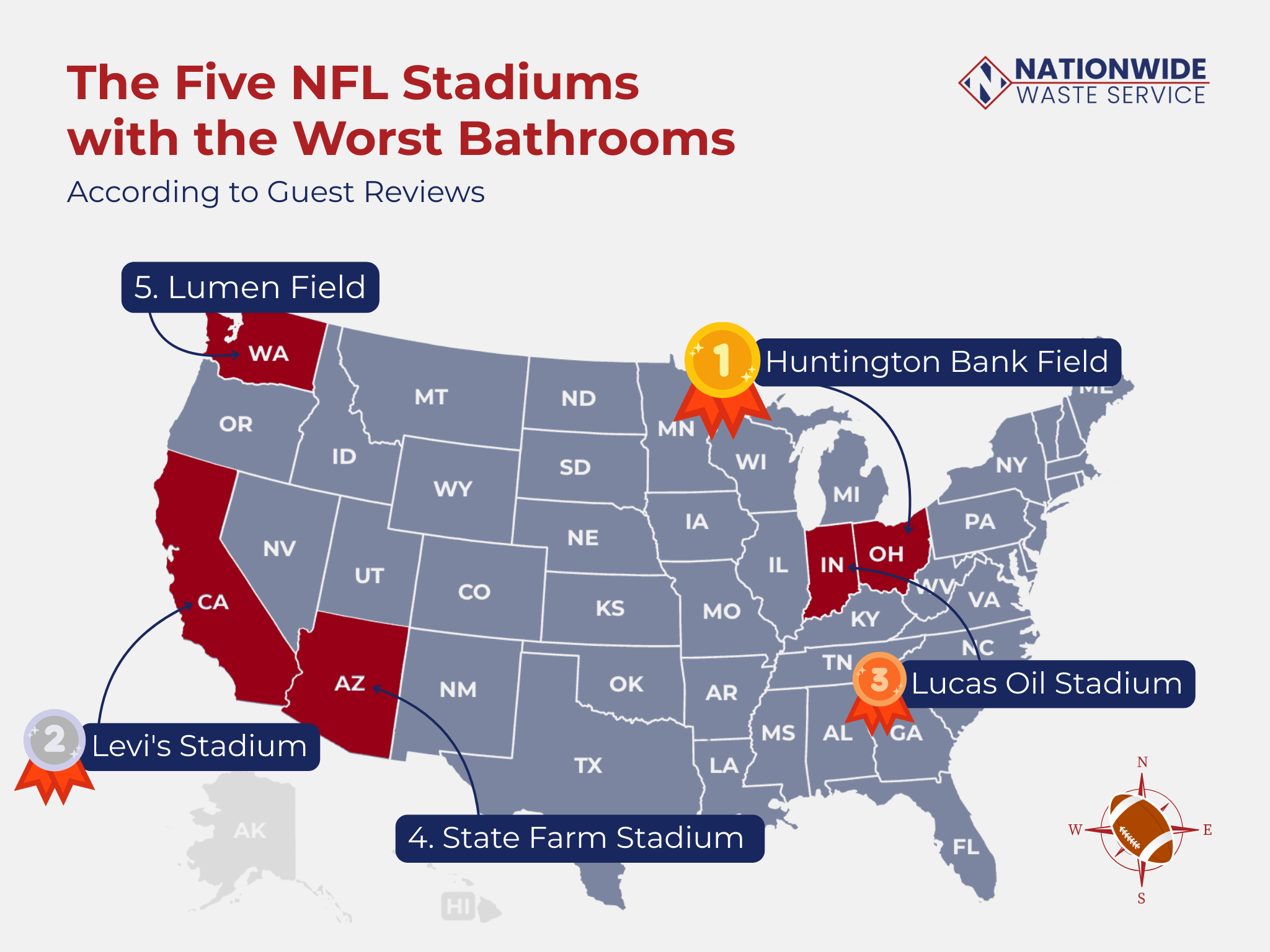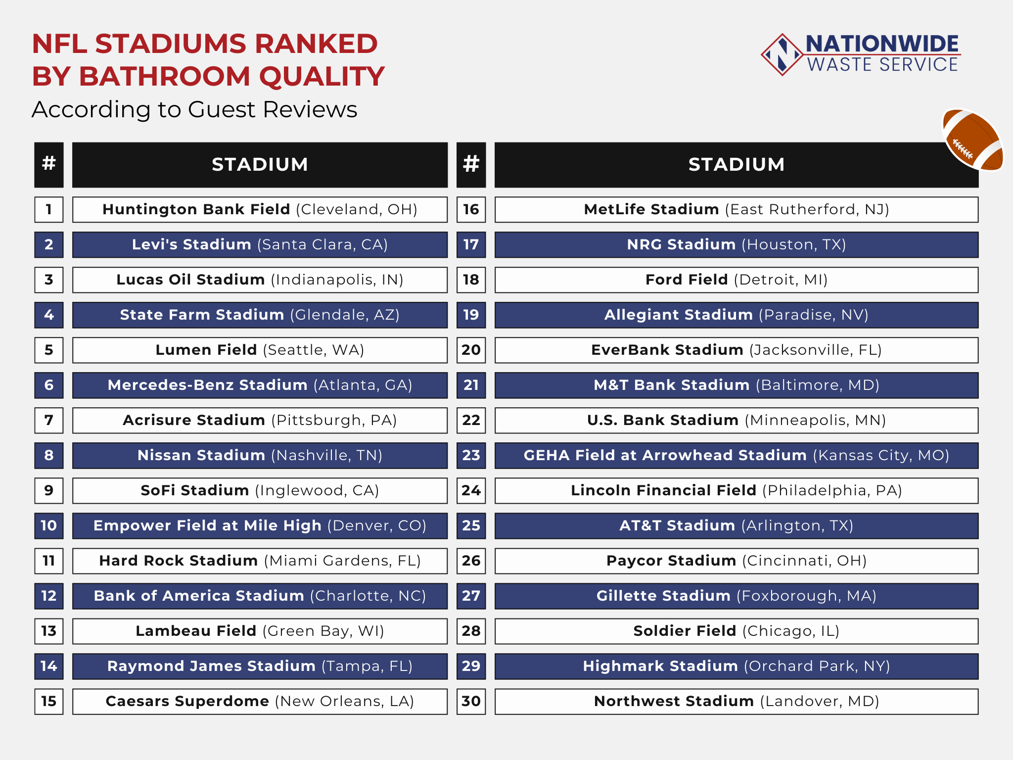 GILBERT, AZ, UNITED STATES, September 29, 2025 /EINPresswire.com/ — Touchdowns and tailgates may define game day, but for many NFL fans, the most critical play happens during a bathroom break. A new nationwide study by Nationwide Waste Service analyzed more than 200,000 fan reviews to rank all 30 NFL stadiums on bathroom quality — from cleanliness to wait times.
