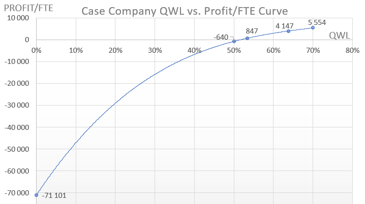 At a hypothetical baseline where QWL equals zero, Treili would generate no customer value. Revenue collapses to zero while personnel and fixed costs remain unchanged. In this scenario, the company’s EBITDA is –€12.7 million, corresponding to –€71,101 per employee. This outcome is mathematically unavoidable and defines the lower boundary of human capital utilization.