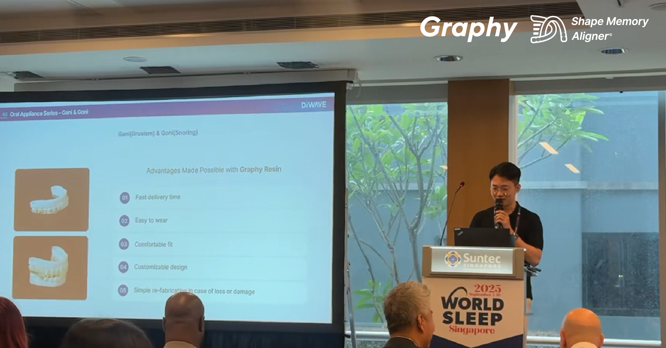 Dr. Keoncheol Woo introduces the application of Graphy’s Shape Memory Aligner (SMA) for bruxism and snoring therapy during his lecture at World Sleep 2025, held in Singapore.